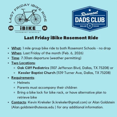 Back to All Events Last Friday Ride Friday, February 6, 2026 7:30 AM 8:30 AM Rosemont Dads Club 719 North Montclair Avenue Dallas, TX, 75208 United States (map) Google Calendar ICS